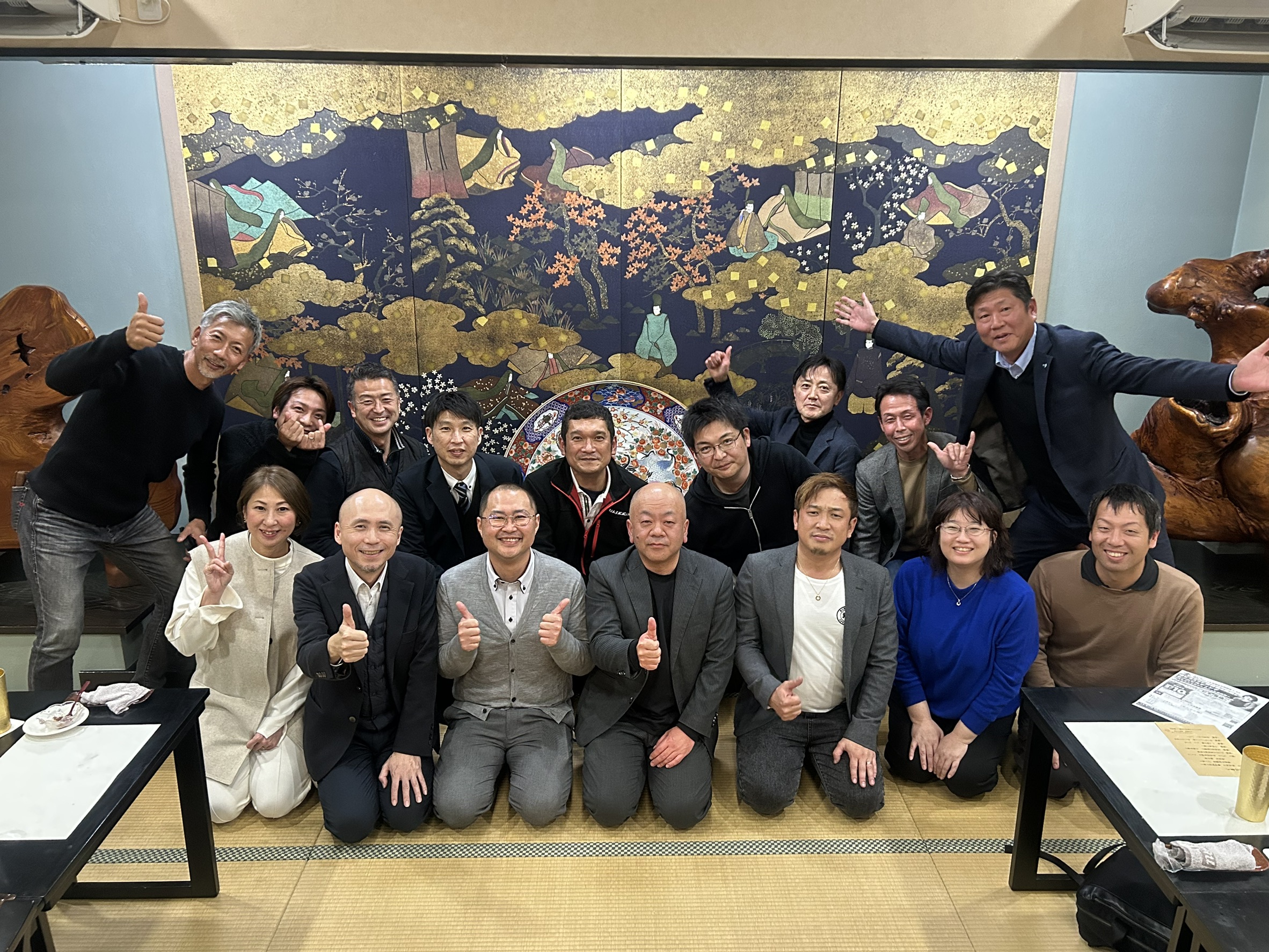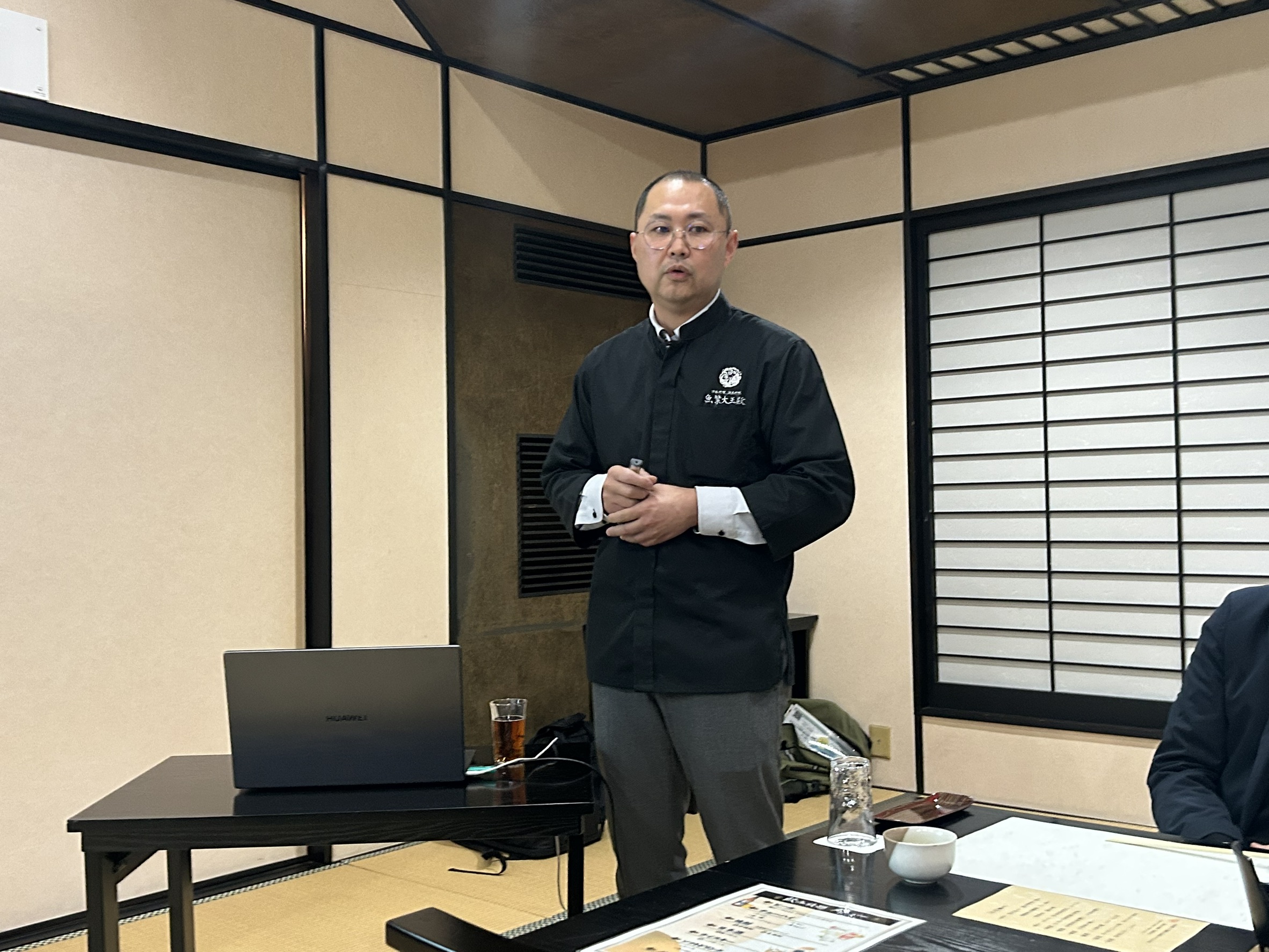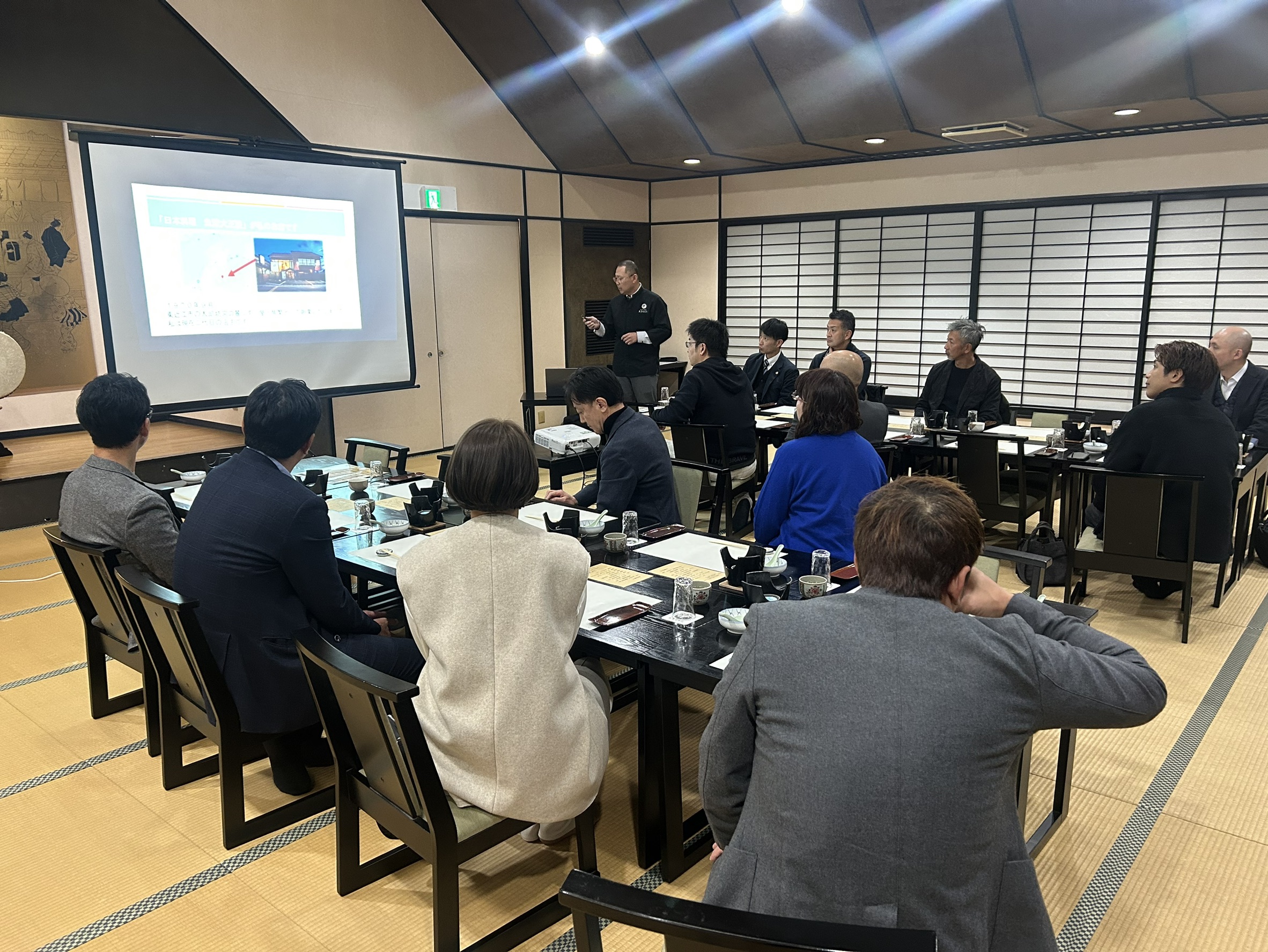 12月25日㈭18時半~21時に魚繁大王殿にて東近江支部12月望年例会を開催し、支部会員17名が参加しました。経営体験報告では「日本食・嚥下食を世界へ」をテーマに、岩崎 勝さん(魚繫大王殿 料理長)よりお話しいただきました。